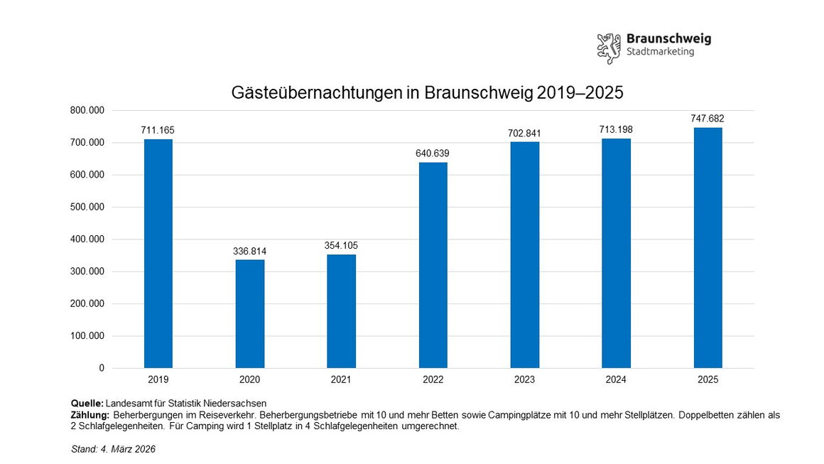 Gute Nachricht für Braunschweigs Tourismus: Das Jahr 2025 endet mit gestiegenen Ankünften und Übernachtungen von Gästen. So erfasste das Landesamt für Statistik Niedersachsen (LSN) in der Löwenstadt mehr als 408.000 Gästeankünfte, was einer Steigerung um rund zehn Prozent im Vergleich zu 2024 entspricht, und rund 748.000 Übernachtungen. Damit liegen die Übernachtungen um knapp drei Prozent höher als im Vorjahr.